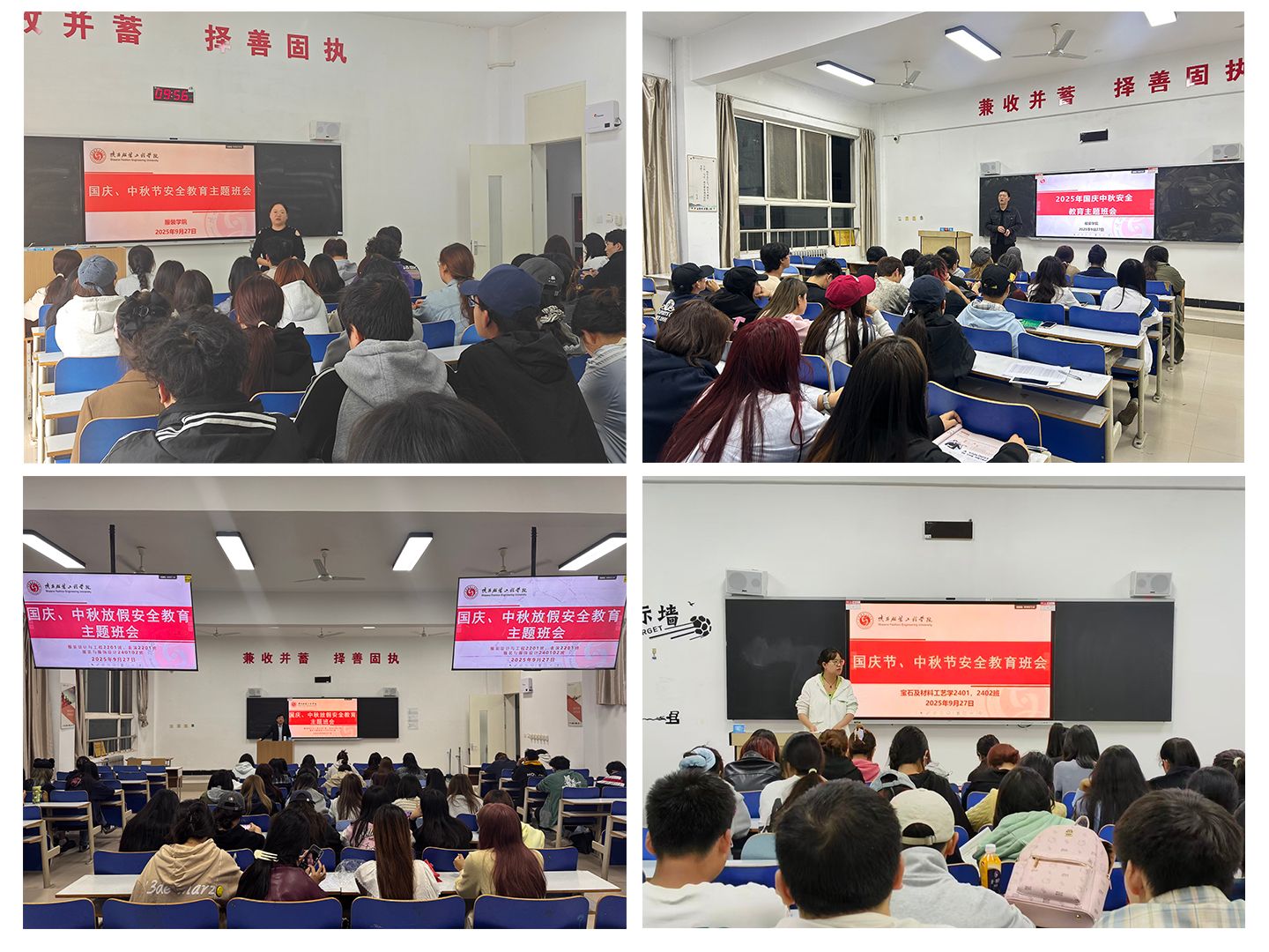 晚自习,各班辅导员针对双节期间学生安全教育主题班会。首先结合生动案例,强调假期安全的重要性。在交通安全方面,提醒学生优先选择正规交通工具。在人身财产安全方面,尤其是在网络安全方面,防范电信网络诈骗。针对宿舍管理安全,明确要求了学生离开宿舍前关闭电源、水源,锁好门窗,严禁留存易燃易爆物品;此外,还对饮食安全、心理安全、消防安全、防溺水安全及假期留校学生安全管理,教育引导全体学生树立“安全第一”的理念。