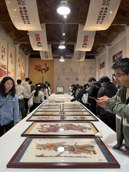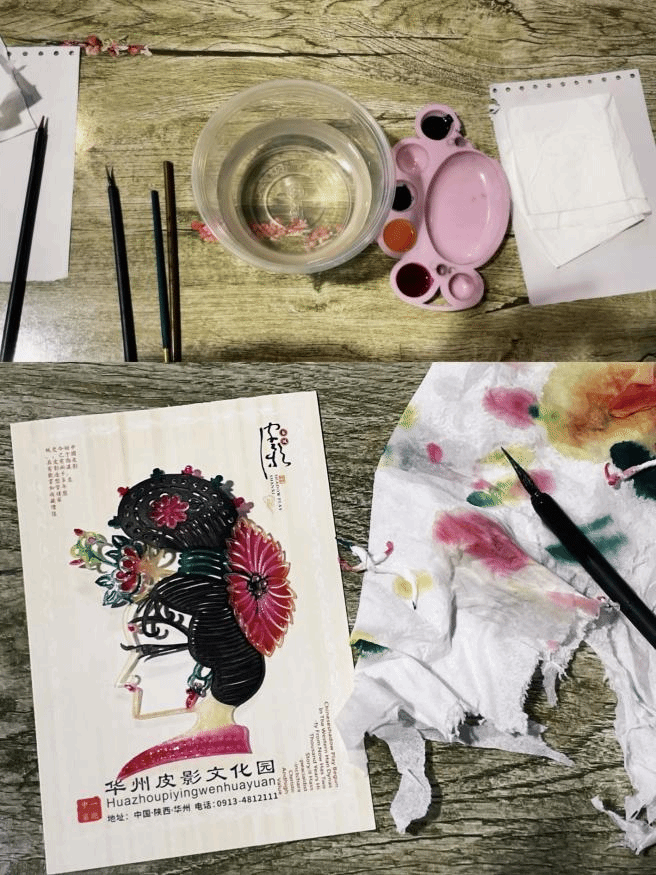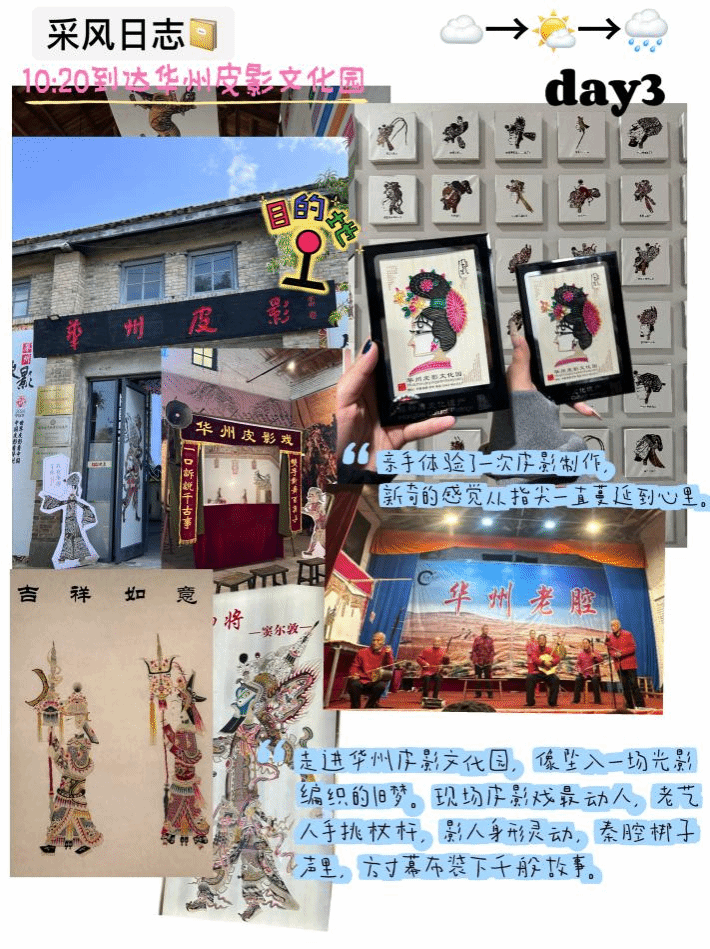 10月16日,采风团队奔赴渭南市华州皮影文化园。在工作人员的讲解下,同学们系统了解了皮影从汉代起源、明清鼎盛,到2011年入选世界非物质文化遗产的发展历程,深刻认识到这门艺术的文化价值。随后,平均年龄80岁以上的老艺人登台,用精湛技艺演绎了《劈山救母》《卖货郎》两段经典皮影戏,灵活的皮影动作、婉转的唱腔让同学们看得入迷。在表演结束后大家纷纷和老艺人合影留念。在体验环节,大家亲手为皮影上色,从调和颜料到细致晕染,切实感受“工笔重彩”的独特魅力。指导老师带领大家分析皮影的镂空造型、色彩对比,“皮影的‘虚实结合’理念,完全可以运用到服饰剪裁;其鲜明的色彩搭配,也能为毕业设计的配色提供参考,而非遗传承中的“守正创新”精神,更值得融入毕业设计的创作理念。”同学们纷纷表示,此次体验不仅读懂了皮影艺术的匠心,更找到了传统文化与服饰设计的结合点。