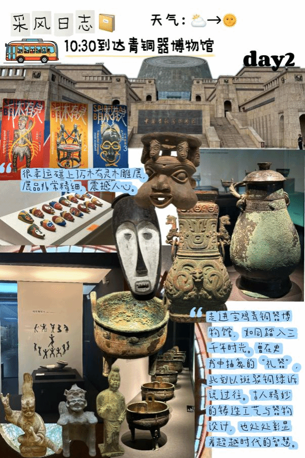 10月15日,采风团队抵达宝鸡青铜器博物院。馆内12000余件馆藏文物中,一级文物多达120余件,镇馆之宝何尊上“宅兹中国”的铭文与曼妙蜿蜒的蛇纹纹饰尤其引人关注。大家用相机记录文物细节,在老师的指导下,用速写本快速勾勒器物上的饕餮纹、云雷纹。学生们表示,“如此细腻的纹路在没有现代工具的年代打造出来,太震撼了!”同学们围着文物轻声交流。指尖划过纸面的瞬间,仿佛与千年前铸造青铜器的工匠完成了一场跨越时空的对话。
