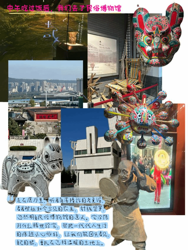 当日下午,团队乘大巴前往宝鸡民俗博物馆。这座聚焦西府民俗的专题场馆,通过“人之初”“婚嫁娶”“福禄寿”三大展厅,完整还原了关中人生老病死的文化轨迹。馆内不仅陈列着虎头鞋、老式缝纫机、婚嫁凤冠等展品;还有“诞生礼”“成人礼”“婚礼”“葬礼”的场景还原,生动展现了关中地区人生重要节点的民俗仪式;端午挂艾草、中秋赏明月等节日主题展区,更让大家沉浸式感受传统民俗的温度。在指导老师引导下,学生们纷纷用手机、速写本记录灵感,将民俗物品的色彩搭配、纹样寓意作为鲜活的设计素材,通过老师的指导开始思考如何让传统民俗符号在现代服饰中“活”起来。