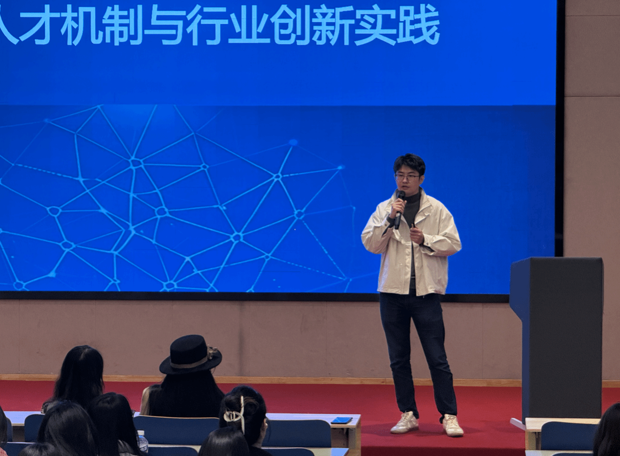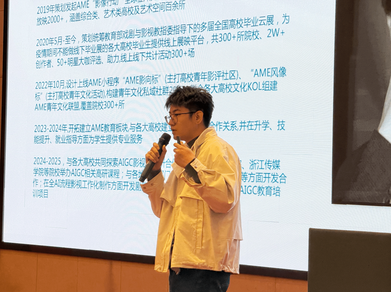 其次,由杭州岸墨影视传媒有限公司联合创始人、AIGC应用创新联合体副秘书长、数创星云(杭州)科技有限公司总经理赵鸣昊为师生带来精彩分享。赵鸣昊经理结合自身在AIGC领域的实战经验,深入阐述了人工智能在影视、时尚等艺术方向中的创新应用,并展示了多个由AI生成的影像与数字时尚案例。赵鸣昊表示,“艺术专业+AI技能=就业竞争力翻倍”,鼓励学生积极掌握AIGC创作工具,将艺术专业与人工智能深度融合,在未来的创作与就业中抢占先机。