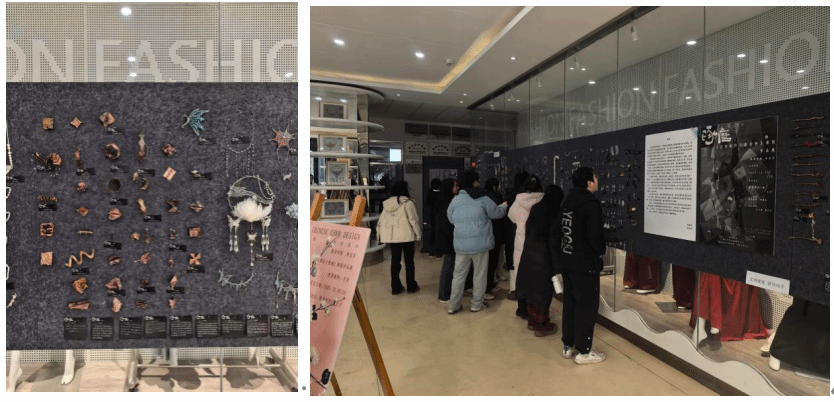 展览的另一大核心亮点,是宝石及材料工艺学2301班《首饰制作与新材料》课程所呈现的逾两百件创意首饰实物作品。这些作品彻底打破了传统珠宝以贵金属宝石为主的材料边界,呈现出令人惊叹的多元面貌。学生们深入探索了木质的温润肌理、皮质的柔韧可塑、塑料的透明色彩与工业质感,以及珍珠贝母的天然虹彩。在金属材料方面,重点运用了铜材进行锻造、蚀刻与氧化着色实验,并通过复杂的金属编织工艺,将坚硬的金属丝化为柔美流畅的线条。每一件作品都是材料语言、工艺技法与设计观念的交融碰撞,充分体现了课程“以材料驱动设计,以工艺实现创意”的教学主旨。