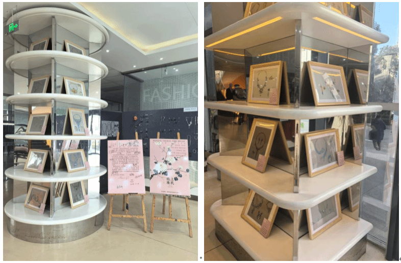步入展厅,观众瞬间被充满创意与匠心的作品所包围。来自宝石及材料工艺学240102班的《首饰设计基础》课程板块,展出了同学们精心绘制的手绘首饰效果图。这些图纸笔触细腻,构思新颖,从古典纹样的现代诠释到未来主义的大胆构想,清晰展现了学生们从灵感萌发到设计成型的最初轨迹,扎实的绘画功底与活跃的设计思维跃然纸上。